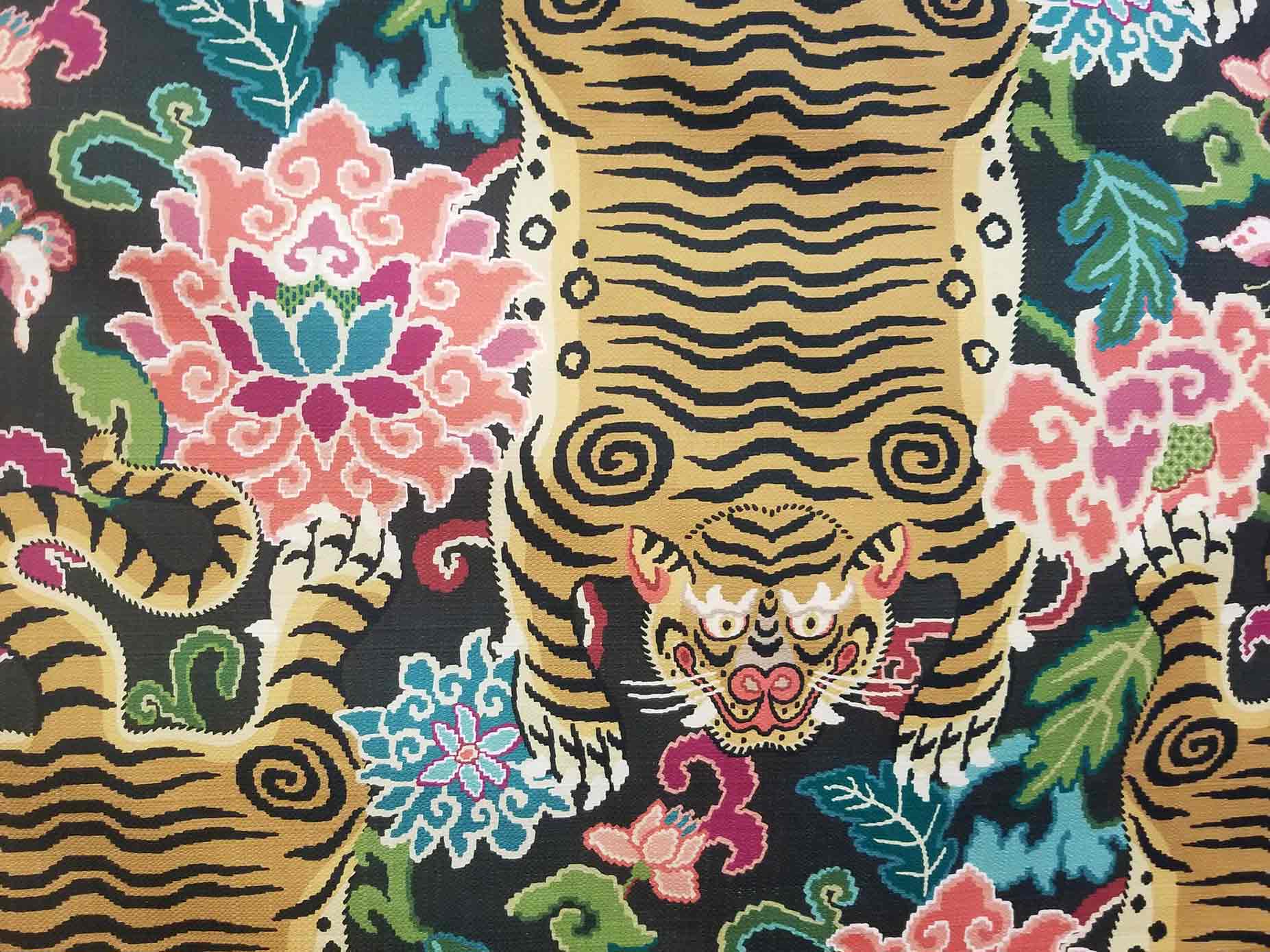 This multi-purpose home decor fabric features a beautiful Asian-inspired tiger design in shades of black, orange, pink, blue, and green. This stunning fabric is ideal for drapes, shades, bedding, table skirts, pillow fabric and more. This fabric is 100% cotton and measures 54 inches wide with a 27 inc inch vertical repeat.